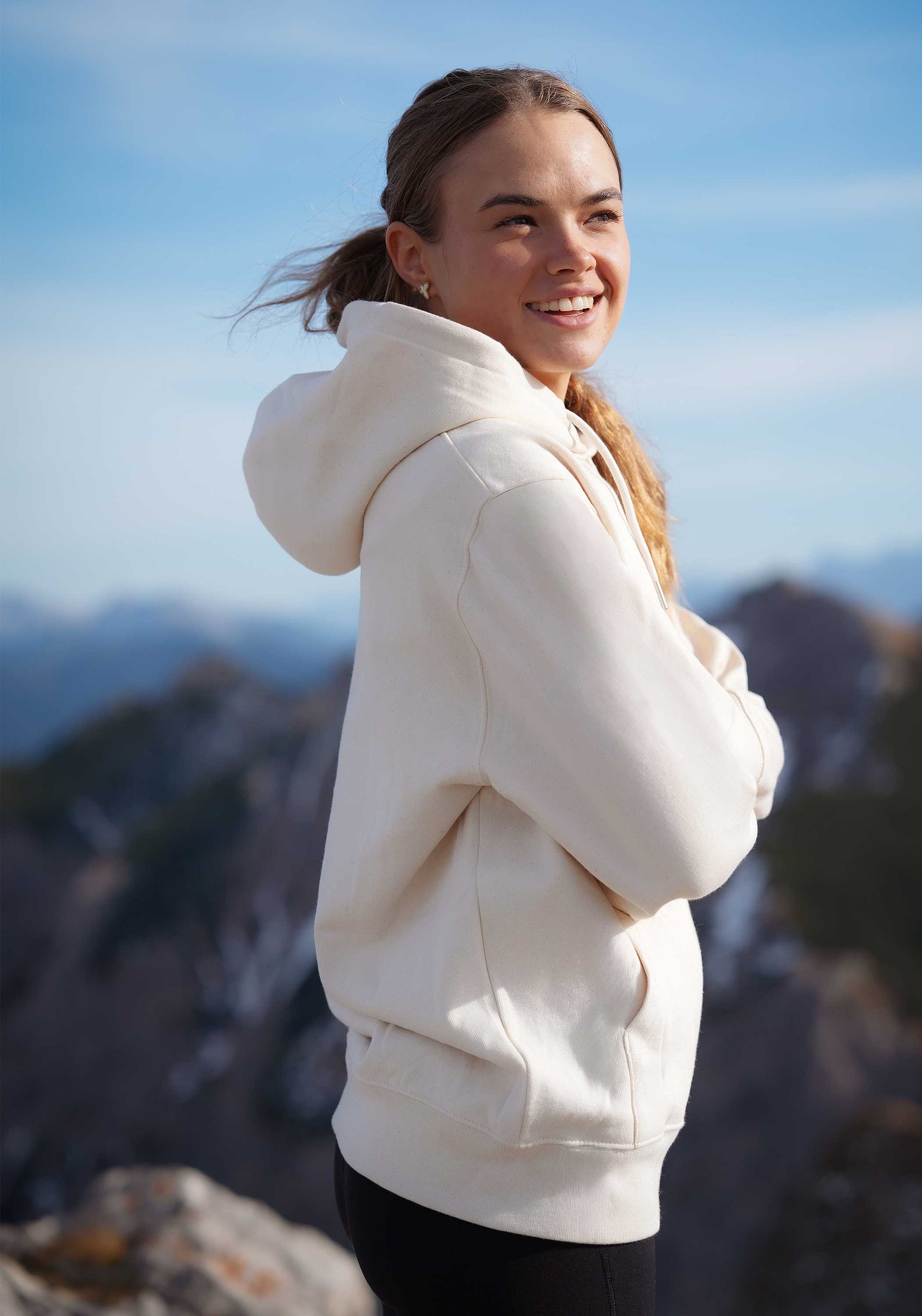 Der Carezza Hoodie ist Unisex und fällt bei Frauen groß aus. Bitte wähle tendenziell eine Nummer kleiner. Svenja ist 173 cm groß und wiegt 56 kg. Sie trägt die Größe XS.